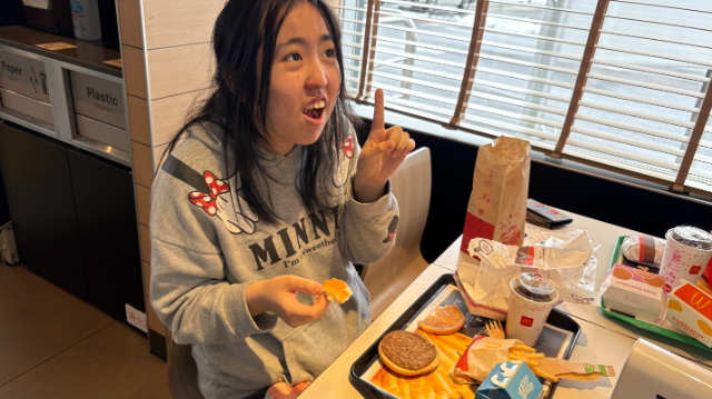 大好きなハンバーガーをほおばって「うーん!最高!」
