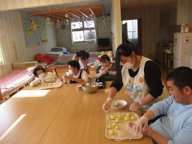祝日だったので、生活介護と放課後等デイサービスの合同でスイートポテト作りを行いました。