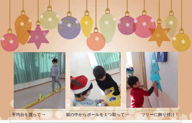 雪だるまがついているカラーコーンをまたいで平均台の上を歩いたり、鈴が鳴らないように紐の上をまたいで歩いたよ。また箱の中からボールを1つ取って同じ飾りを見つけてゴールでツリーに飾り付けをしたよ🌲