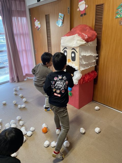 2つ目のゲームは、音楽に合わせてサンタさんの口とフラフープに向かってボール投げ!!