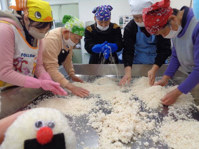 みんなで花の咲いた米麹をポロポロにほぐし…