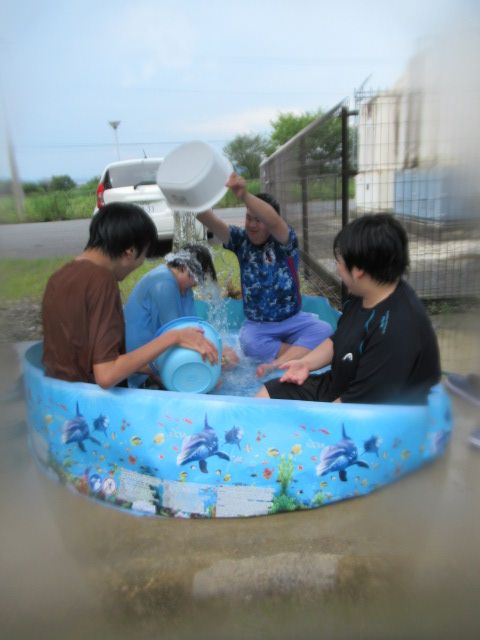 暑~い夏休み、あすなろ放デイでは、水遊びを毎日のように行いました。屋根のある渡り廊下で、上からはスプリンクラーが心地よく、ホースやバケツも使って水を掛け合い、皆さん、とっても楽しんで頂きました◎