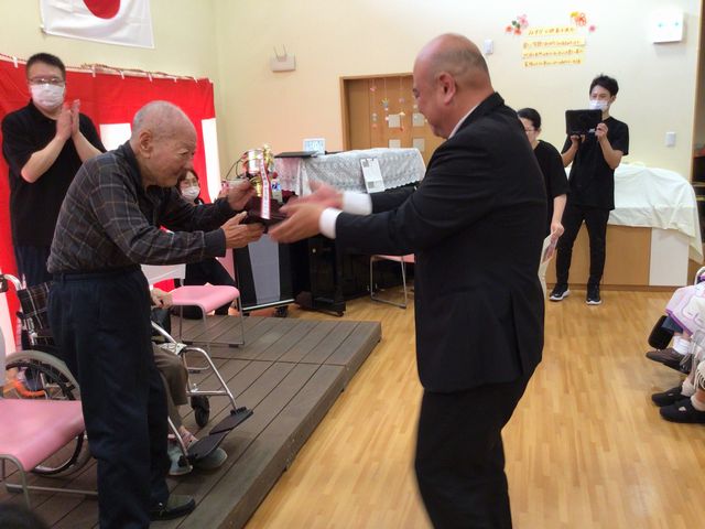 本年は90歳代の方々が多くいらっしゃいました。その方々の代表としてみすぎの郷の最年長であらせられる99歳の男性入居者様にトロフィーを贈らせて頂きました。