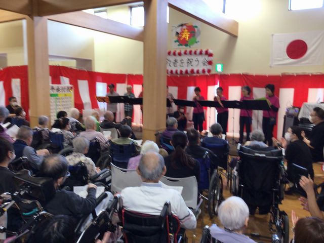 そして最後はオカリナの演奏に合わせ、入居者様、職員で手拍子をされたり、歌を唄い敬老を祝う会を楽しまれました。来年は100歳になられる方々もいらっしゃるので来年は100歳のお祝いもかねて今年以上に盛大に行いたいですね。