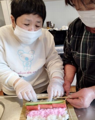 世話人さんと太巻きを巻いて