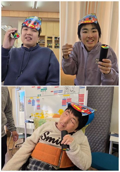 会が始まる前に、カメラを向けると、鬼のお面や手作りの恵方巻レプリカを持ち笑顔で「写真撮って~」とポーズを取っていました。