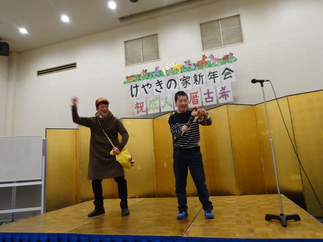 新春紅白カラオケ大会・第二部オープニングはドンキーコング大好き利用者様と輕部所長によるパフォーマンスです🐵