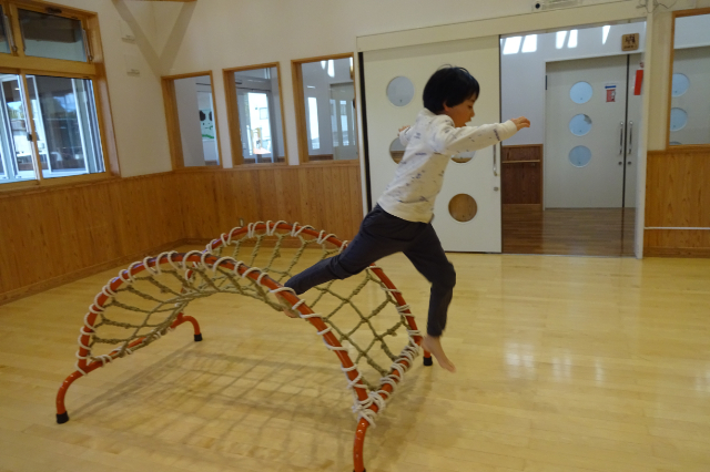 体を大きく使ってジャンプしてハードルを飛び越え、空を飛ぶ気分でトランポリンを3回ジャンプ、それから太鼓橋を上ります!😆