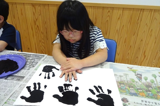 羽に見立てた手形を押して、こうもりを作っていきます🦇