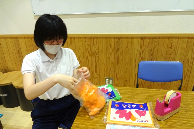 次にビニール袋に花紙を詰めてかぼちゃを作ります🎃