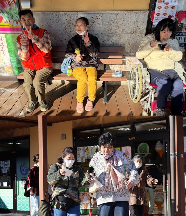 みなさん、歩いてハイウェーイパークへ…、各職員と利用者さんとまずは🍦アイスクリームを…