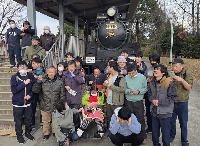 今日も、まずはトイレ休憩後、SL機関車の見学です。運転席や車輪の大きさにビックリし、記念写真。