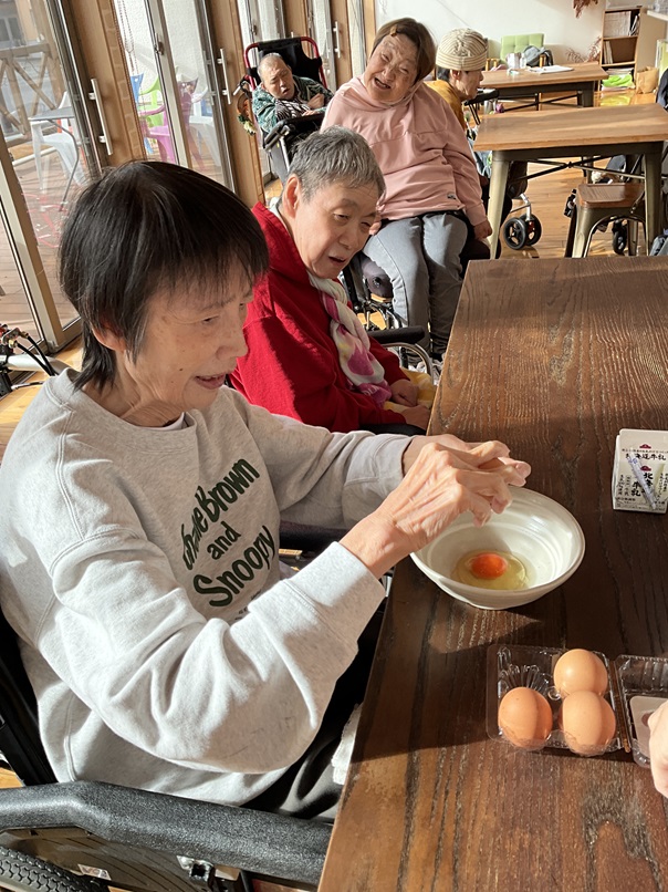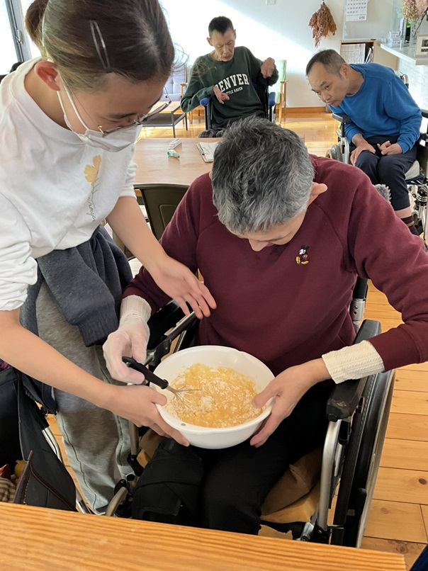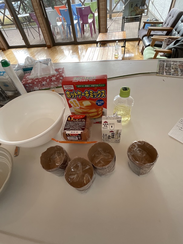牛乳やホットケーキミックスを入れ、混ぜている所です